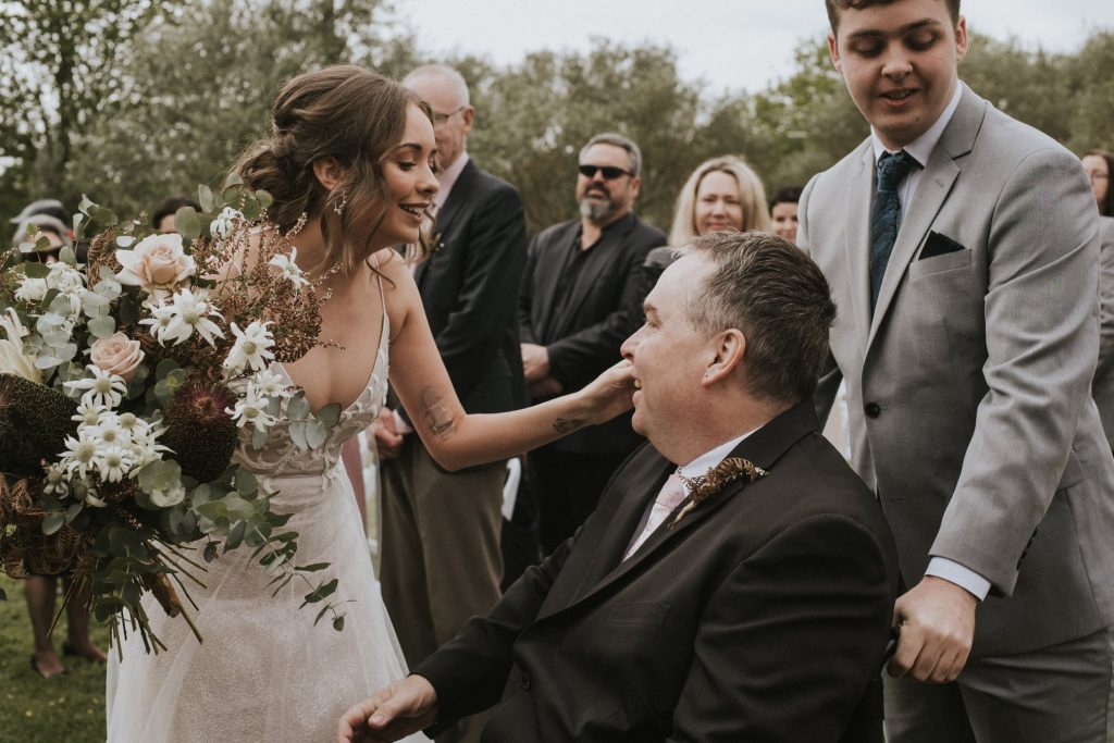 We arrived at La Grange Estate on a Friday for a wedding practice. A lovely location in the Adelaide Hills. Jasmine and Bailey are to be married in a paddock, and the bride and bridesmaids walk around 300 metres. I sat in my manual wheelchair at the half-way point and watched the four bridesmaids walked past me. My son Ben escorted Jasmine to me, and he pushed my manual chair to Bailey. One of my hands held tightly to my knee to assist with my balance, and the other held Jasmine’s hand. It seemed fitting the ‘three of us’ walk down the aisle together.