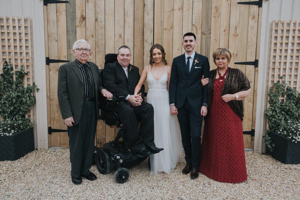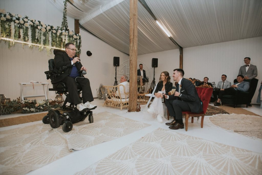 After swapping into my powered wheelchair, it was easier to get around. I could raise myself higher for the photos and the reception. Bailey’s dad, myself and best man Eddie shared our speeches. Without knowing each other’s speeches, they turned into a stand-up comedy competition. The wedding and reception was a happy time.