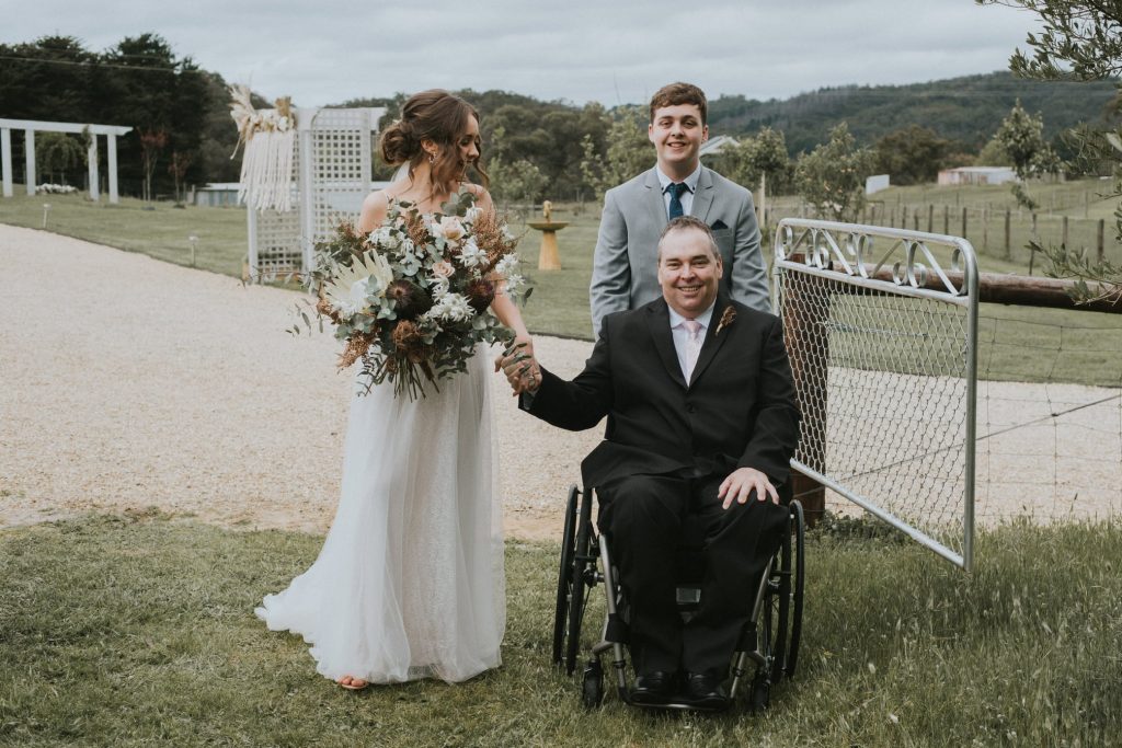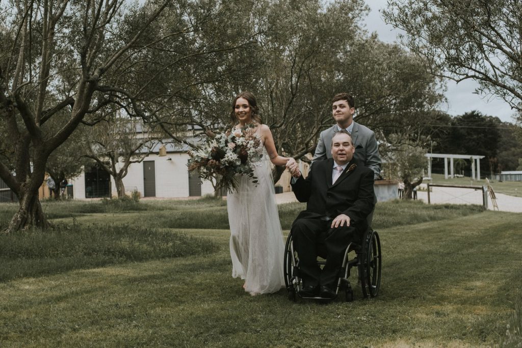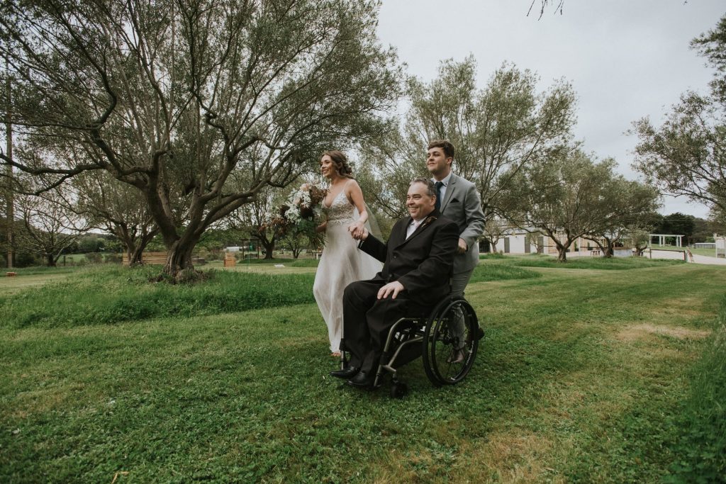 We arrived at La Grange Estate on a Friday for a wedding practice. A lovely location in the Adelaide Hills. Jasmine and Bailey are to be married in a paddock, and the bride and bridesmaids walk around 300 metres. I sat in my manual wheelchair at the half-way point and watched the four bridesmaids walked past me. My son Ben escorted Jasmine to me, and he pushed my manual chair to Bailey. One of my hands held tightly to my knee to assist with my balance, and the other held Jasmine’s hand. It seemed fitting the ‘three of us’ walk down the aisle together.