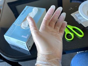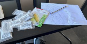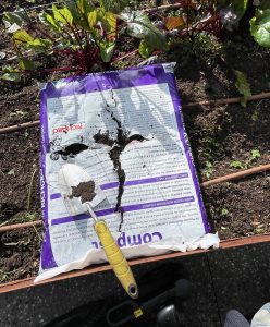 After pulling out the remaining beetroot, I pull up weeds and evenly spread out the mushroom compost. I wear thin plastic gloves to keep my hands from getting dirty and I retain the ability to pick up seeds. I put together a plan, providing each plan sufficient room to grow, and leaving a few empty spots for future seed plantings.
