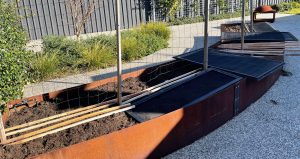 To prevent Spartacus from disturbing the soil, I place old window flyscreens and tomato stakes on the locations of the seeds. As the plants grow, I place the shields higher, until the plants are sufficiently large.