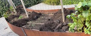 After arriving home, I take one bag out at a time and place each bag on my legs and carry it to the raised garden bed. I won’t be able to lift bags from the ground, sit the first two bags upright and ask a friend for assistance in moving the remaining twelve bags of mushroom compost to the garden. Unfortunately, they ignore the clue provided to them and place my initial two bags onto the ground, and stack the other bags on top. Later, I would ask another friend to stand the two bags up, allowing me to grab them.
